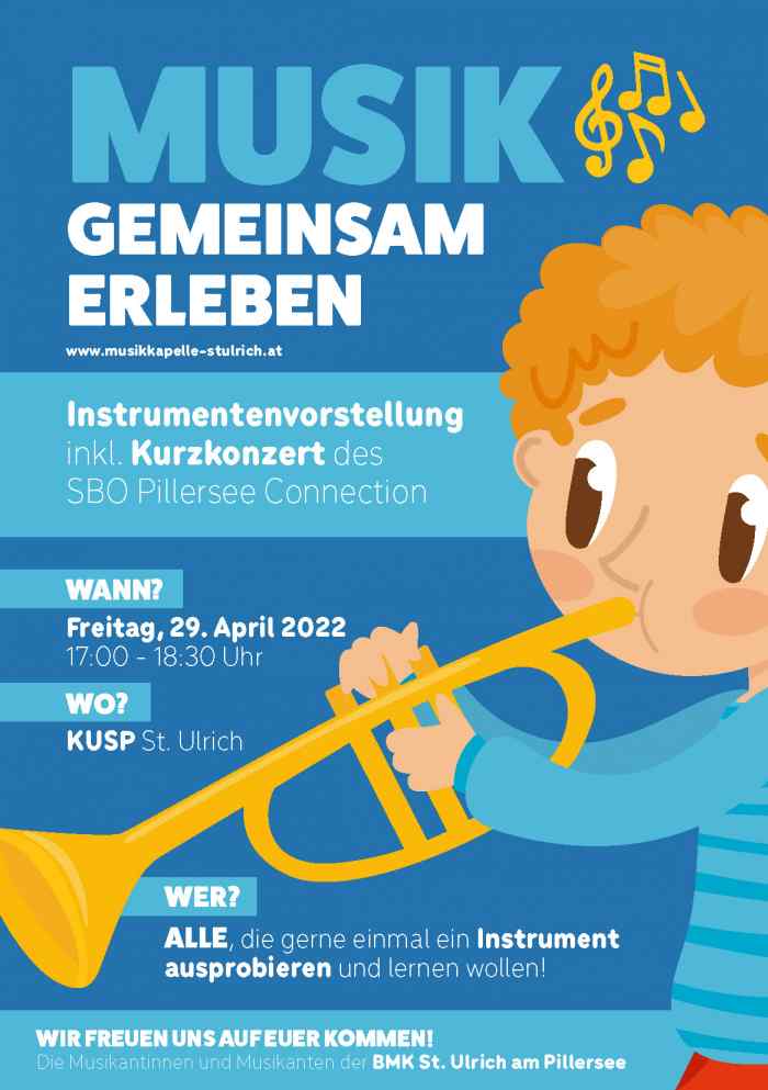 Die Veranstaltung startet um 17.00 Uhr und findet im Kultur- und Sportzentrum St. Ulrich statt. Das Jugendreferentinnen-Team und die Musikantinnen und Musikanten der BMK St. Ulrich am Pillersee freuen sich auf euren Besuch - denn GEMEINSAM macht es einfach mehr Spaß, Musik zu erleben!